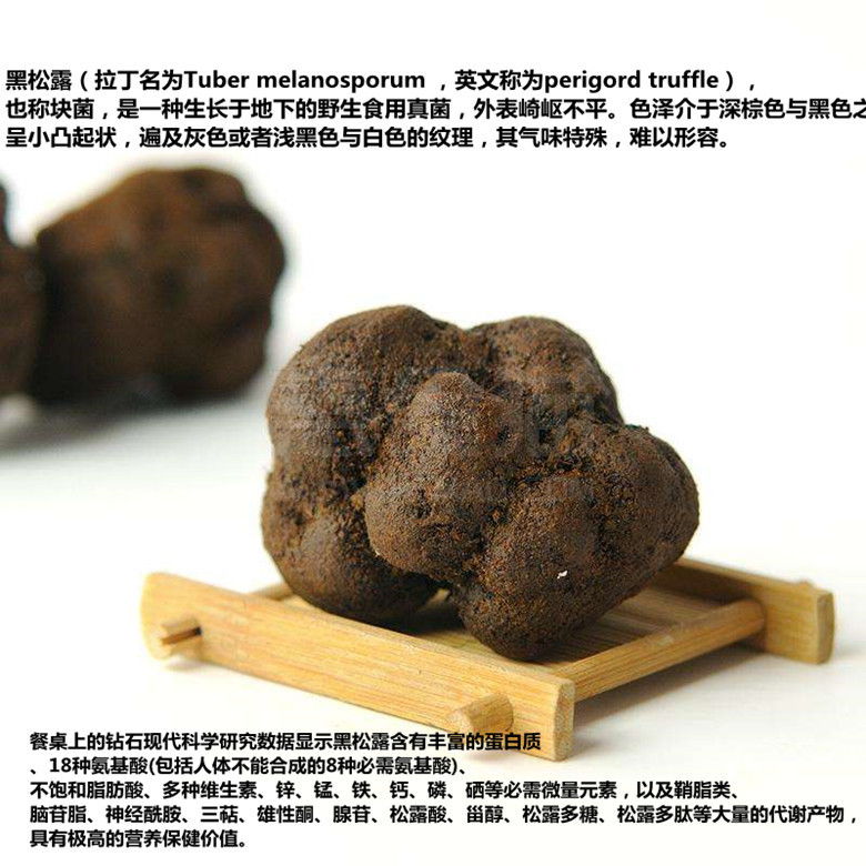 “餐桌上的钻石”。现代科学研究数据显示黑松露含有丰富的蛋白质、18种氨基酸(包括人体不能合成的8种必需氨基酸)、不饱和脂肪酸、多种维生素、锌、锰、铁、钙、磷、硒等必需微量元素,以及鞘脂类、脑苷脂、神经酰胺、三萜、雄性酮、腺苷、松露酸、甾醇、松露多糖、松露多肽等大量的代谢产物,具有极高的营养保健价值。