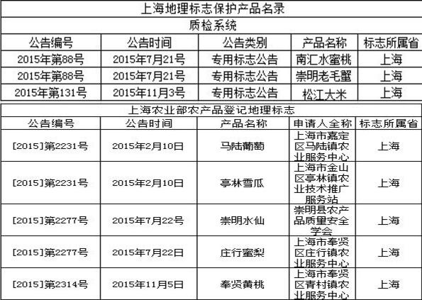 目前上海共有奉贤黄桃、崇明金瓜、金山蟠桃、松江大米、崇明老毛蟹等在内的25个产品被批准为国家地理标志保护。